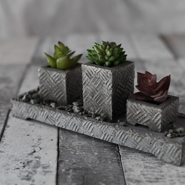 【サイズ】 ●No.55_S(×3個) ・植木鉢 :H 80mm x W 55mm x D 55mm ・プレート:H 5mm x W 50mm x D 50mm ※すべて手作りのため「色調・紋様・サイズなど」は個体差があり、写真とは若干異なる場合があります。予めご承知おきください。 ※写真はイメージです。商品に植物は含まれません。 【商品特徴】 グリーンをこよなく愛するロビー。そんな彼が今注目しているのは「日本の盆栽」。日本古来の伝統美をリスペクトしつつ、現代のライフシーンに融合する新たな素材とテイストで開発されたのが、このNeo Japonism ミニ盆栽鉢シリーズ。その中の一つ「The 網代格子」は「漁網」が由来の日本に古来から受け継がれる伝統紋様。古くから広く民衆に親しまれてきた紋様です。ロビーはその日本古来の古典柄をセメントという現代的素材と融合させ、ミニ盆栽鉢シリーズとして展開。日本のライフシーンを考慮し、机上などの狭いスペースでも気軽にグリーンが楽しめるスリムな設計。個性的なルックスだけでなく、小さいながらも保水性や水捌けもしっかり考慮し植物にも優しい。多様な植物を育てるあなたにぴったりな3個を1セットに。鉢サイズに見合ったグリーンを植えるだけで、いとも簡単に「侘び寂び」が表現できる。また、ミニ鉢と統一感のあるプレートもセットに。そのクールな世界観はロビーならでは。一つ一つ丁寧にロビー本人が仕上げた逸品。ギフト・プレゼントにも最適。 【素材】 ネオジャポニズムを提唱するロビー。その考えは素材選びにも反映されており、主要素材は現代建築を想起させる「セメント」が使用されています。よって強度は、植木鉢としては全くと言っていい程問題ありませんが、一般的な陶器と同様、落下や衝撃によって欠けや破損の恐れがあります。特にロビーの作品はシャープなデザインが多い為、鋭角な部分は欠ける場合があります。「植物の成長と共に、鉢のエイジングも楽しむ。」という、ロビーのコンセプトをご理解頂きつつ、お取り扱いには充分ご注意ください。 日本古来のインクである「墨」でセメントを染め上げて作る、独特な手法のロビー作品は、欠ける事により素地の色が露出する事があります。しかし、ロビーはこう言います。「それも含めて僕の作品を楽しんで欲しい」と。もし欠けてしまったら、4B程度の鉛筆で欠けた部分を軽く擦り、指で馴染ませて完了。作品にビンテージ感が増し、より愛着も増す事でしょう。つるっとした一般的な陶器とは異なり、環境次第では苔が活着したり、長年の風雨で染みや色ムラができる事もあるでしょう。植物の成長と共に、作品(植木鉢)の成長も是非楽しんでください。 一般的に植木鉢の原料は「陶器/粘土」が主流とされるなか、何故 ロビーはセメントを選んだのか、その理由を本人に聞いてみました。 ・理由1「重量感」 小さい鉢に少し大きめの植物を植えたい… そのアンバランスさって、とってもクールだよね。でも、すぐ転倒しちゃうんだ。そんな時このセメントの重量感が役に立つんだよね。 ・理由2「保水性」 デメリットでもあるセメントの通気性の悪さ。ミニサイズの鉢にとっては逆に好都合なんだよ。乾きがちなミニポットにとって、乾燥対策はとても重要だからね。 ・理由3「意匠」 この素材はグリーンとの相性もいいし、後は何と言ってもそのルックス。インテリアとしても空間に良く馴染むんだ。グリーンを存分に楽しみたいなら森へ行けばいい。インテリアとして楽しむならやっぱりクールじゃないとね。 【アルカリ性対策】 素材の性質上、一部の植物には適さないアルカリ性がデメリットとしてあげらますが、ロビー・プラントでは植物の成長を考慮し「中和加工」を施していますので、そのまま安心してご利用いただけます。