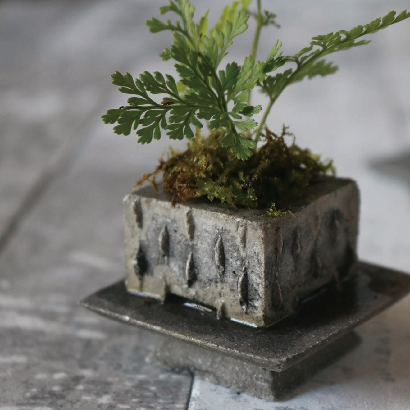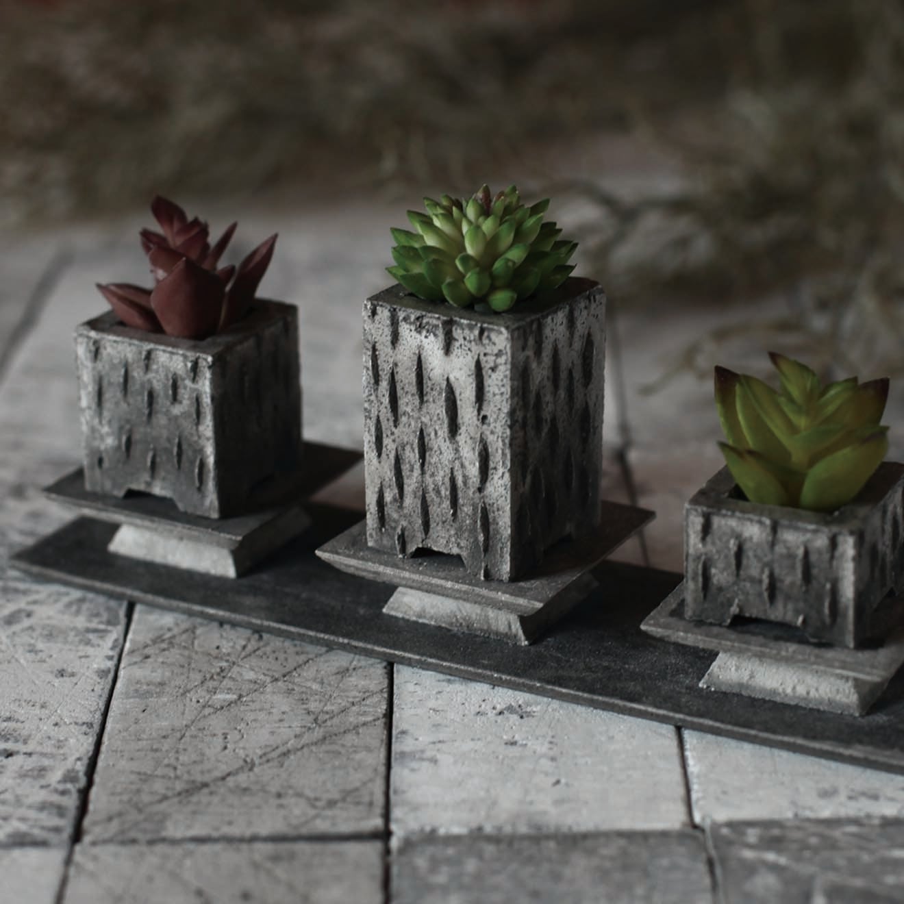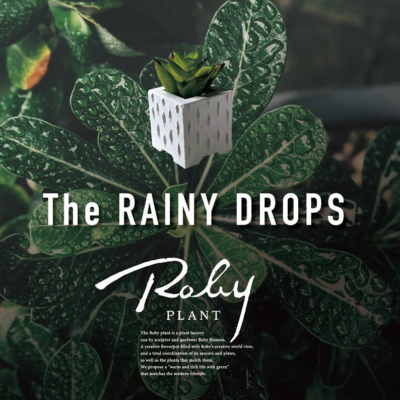 その中の一つ「The RAINY DROPS」は、 その名の通り「自然を潤す恵みの雨」をモチーフにしたデザイン。窓枠や洗面台・机上などの狭く細いスペースでも気軽にグリーンが楽しめるスリムな設計。個性的なルックスだけでなく、小さいながらも保水性や水捌けもしっかり考慮し植物にも優しい。ミニ鉢はL・M・Sの 3サイズが1セットに。鉢サイズに見合ったグリーンを植えるだけで、いとも簡単に「侘び寂び」が表現できる設計。また、ミニ鉢と統一感のあるプレートもセットに。そのクールな世界観はロビーならでは。植物はちょっと苦手という方でも、飾るだけでインテリア小物としてお部屋を華やかに。一つ々々丁寧にロビー・ハンソン本人がハンドメイドで仕上げた逸品。ギフト・プレゼントにも最適。