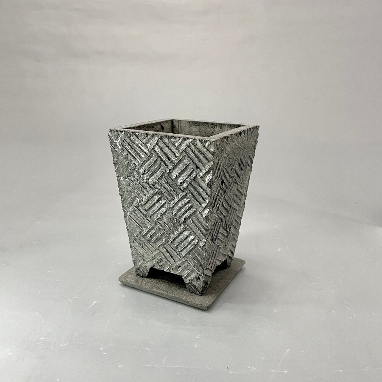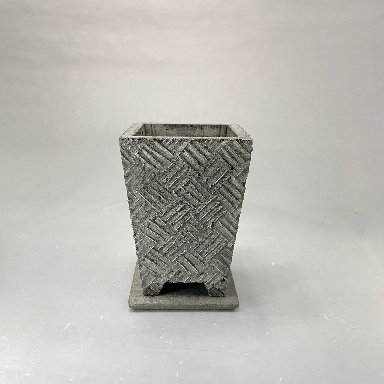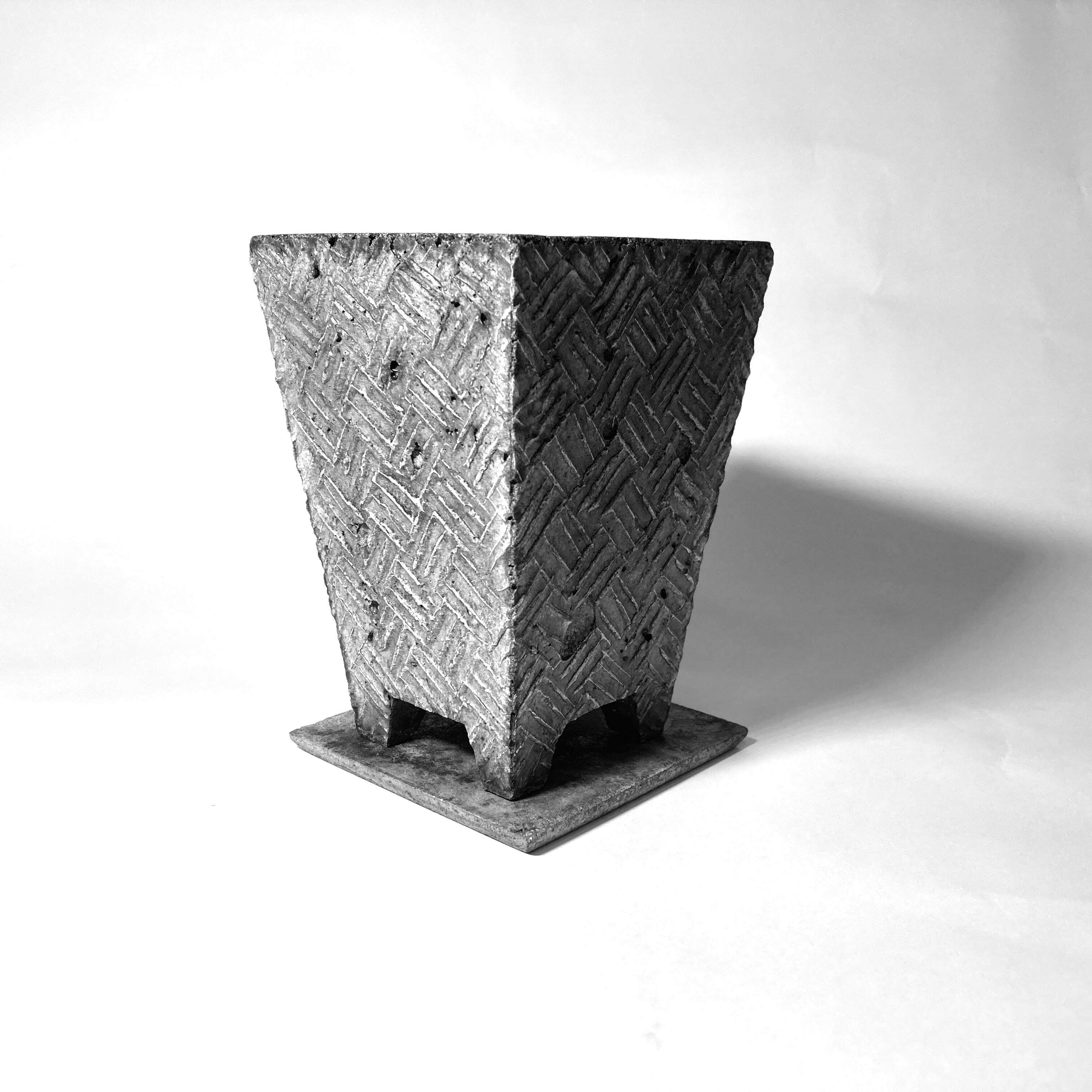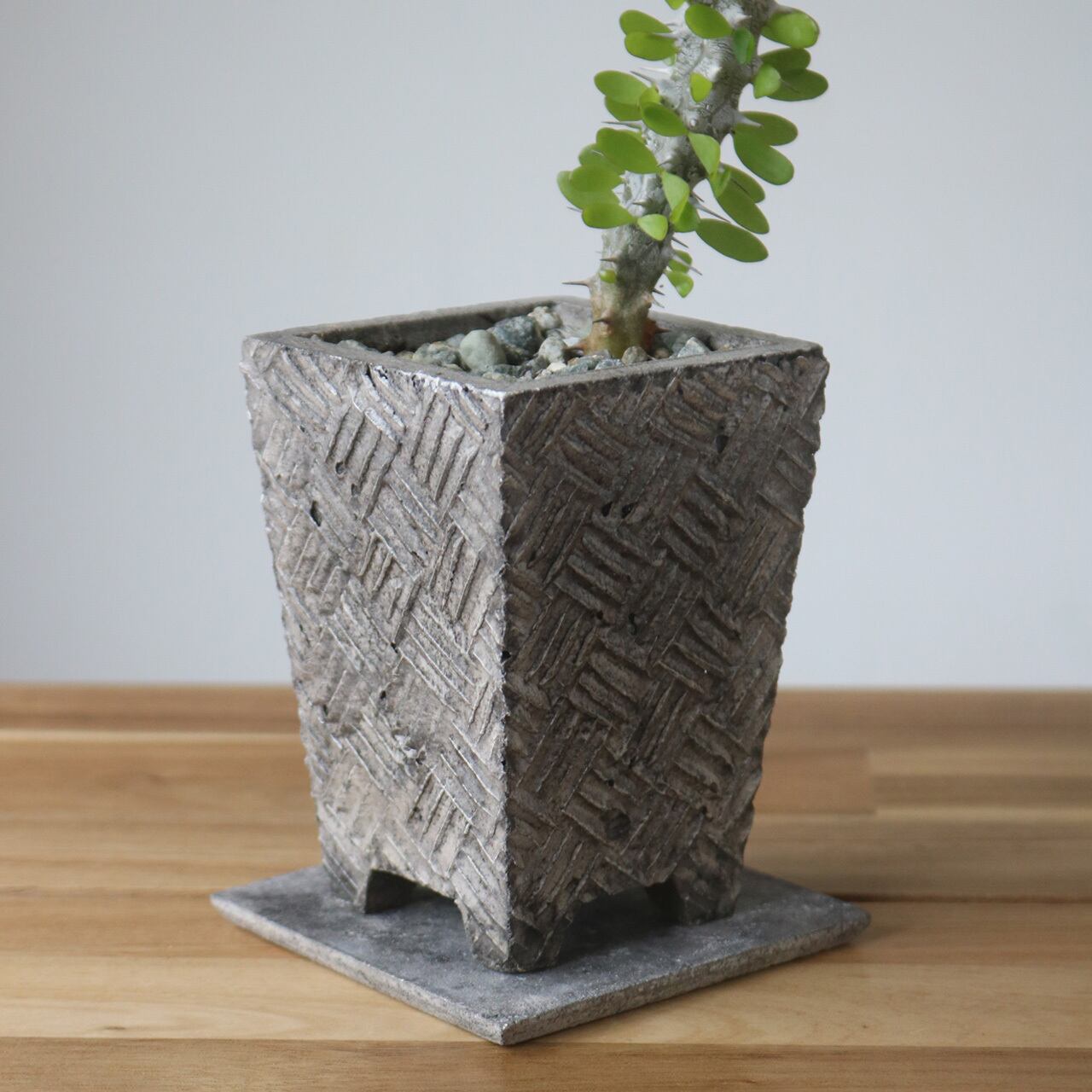 グリーンをこよなく愛するロビー。そんな彼が今注目しているのは「日本の盆栽」。日本古来の伝統美をリスペクトしつつ、現代のライフシーンに融合する新たな素材とテイストで開発されたのが、このNeo Japonism ミニ盆栽鉢シリーズ。その中の一つ「The 網代格子」は「漁網」が由来の日本に古来から受け継がれる伝統紋様。古くから広く民衆に親しまれてきた紋様です。ロビーはその日本古来の古典柄をセメントという現代的素材と融合させ、ミニ盆栽鉢シリーズとして展開。日本のライフシーンを考慮し、机上などの狭いスペースでも気軽にグリーンが楽しめるスリムな設計。個性的なルックスだけでなく、小さいながらも保水性や水捌けもしっかり考慮し植物にも優しい。鉢サイズに見合ったグリーンを植えるだけで、いとも簡単に「侘び寂び」が表現できる。また、ミニ鉢と統一感のあるプレートもセットに。そのクールな世界観はロビーならでは。一つ一つ丁寧にロビー本人が仕上げた逸品。ギフト・プレゼントにも最適。