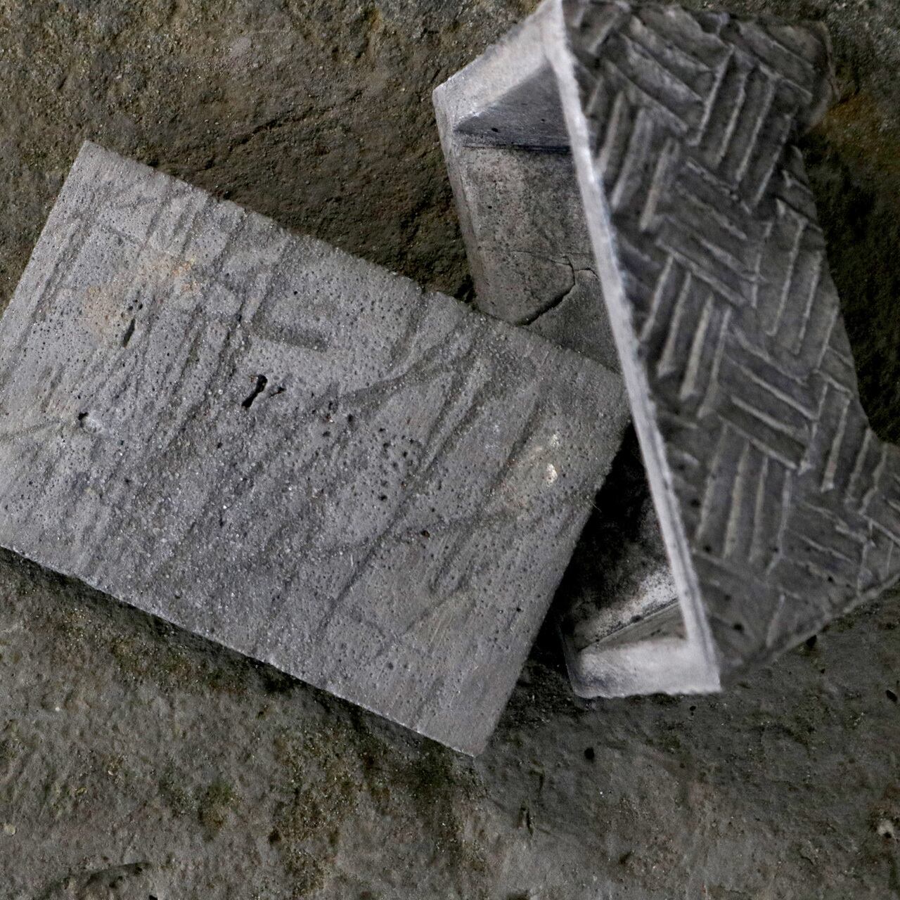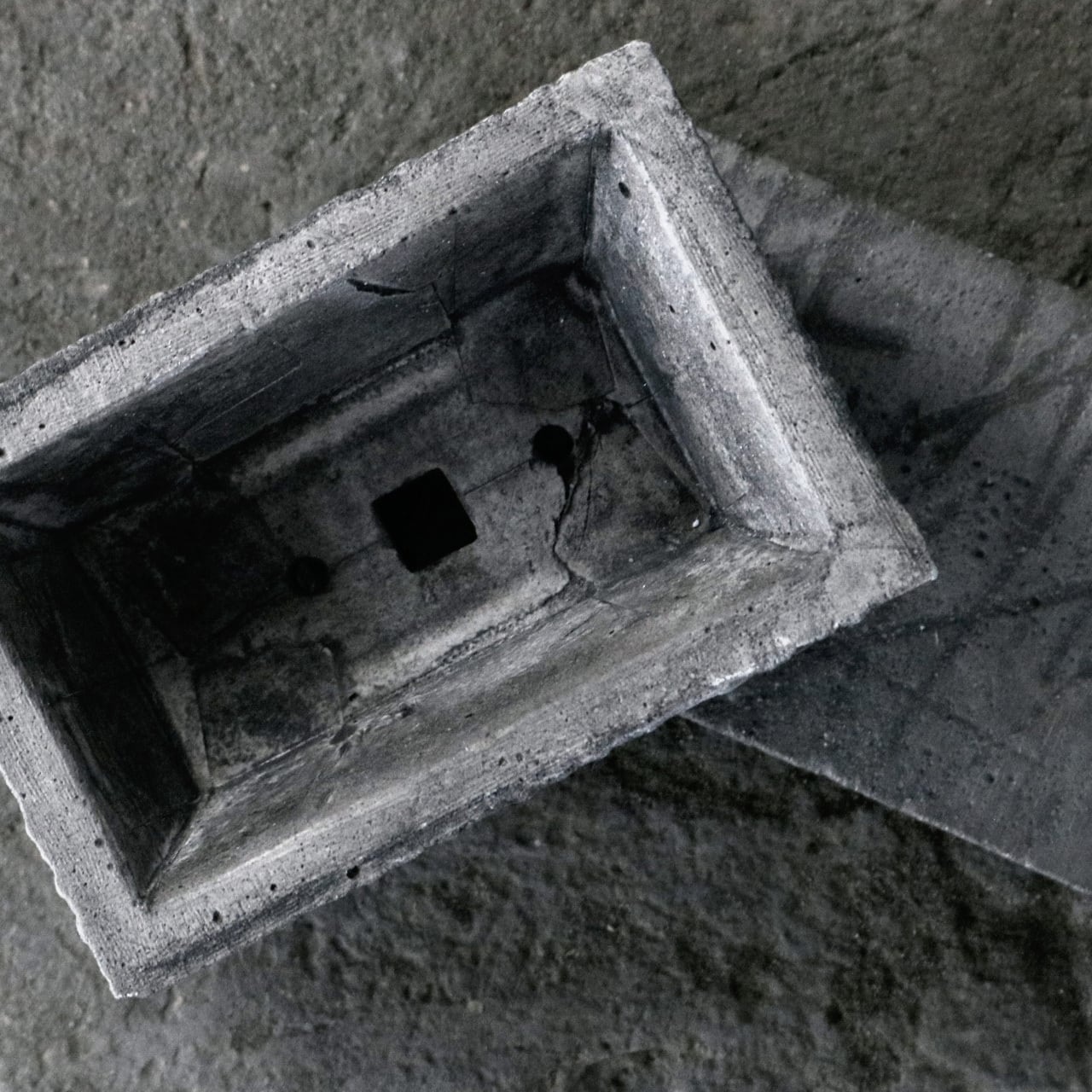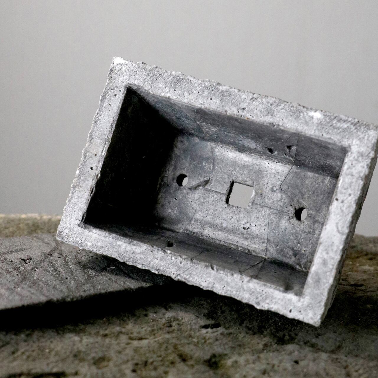 日本古来のインクである「墨」でセメントを染め上げて作る、独特な手法のロビー作品は、欠ける事により素地の色が露出する事があります。しかし、ロビーはこう言います。「それも含めて僕の作品を楽しんで欲しい」と。もし欠けてしまったら、4B程度の鉛筆で欠けた部分を軽く擦り、指で馴染ませて完了。作品にビンテージ感が増し、より愛着も増す事でしょう。つるっとした一般的な陶器とは異なり、環境次第では苔が活着したり、長年の風雨で染みや色ムラができる事もあるでしょう。植物の成長と共に、作品(植木鉢)の成長も是非楽しんでください。