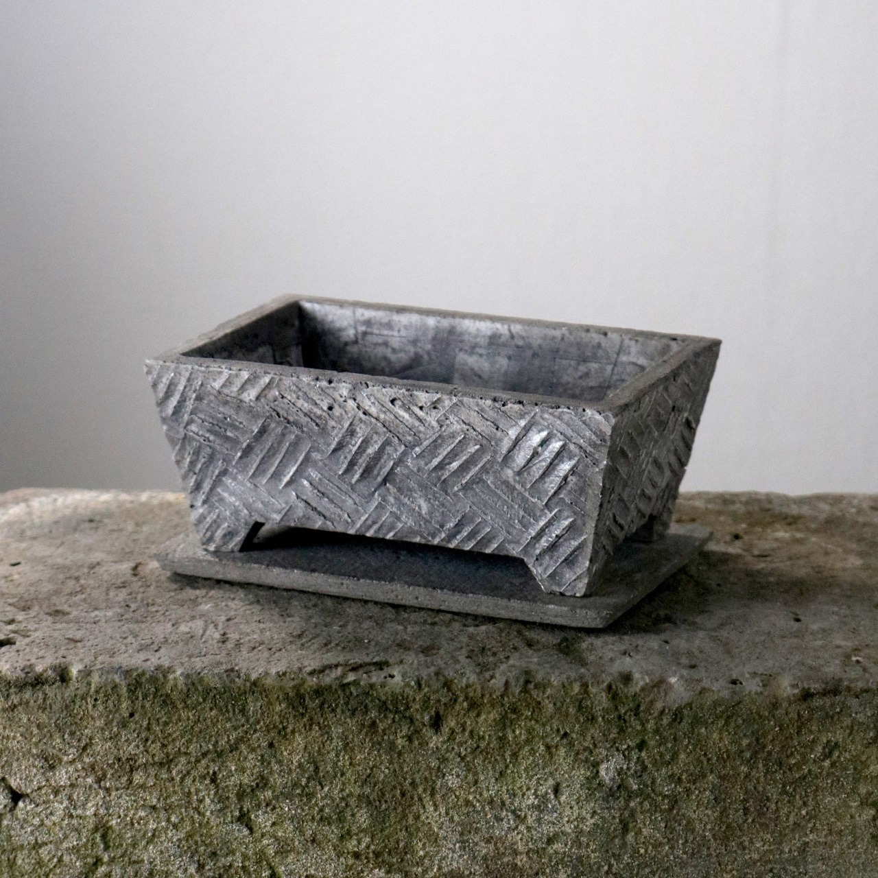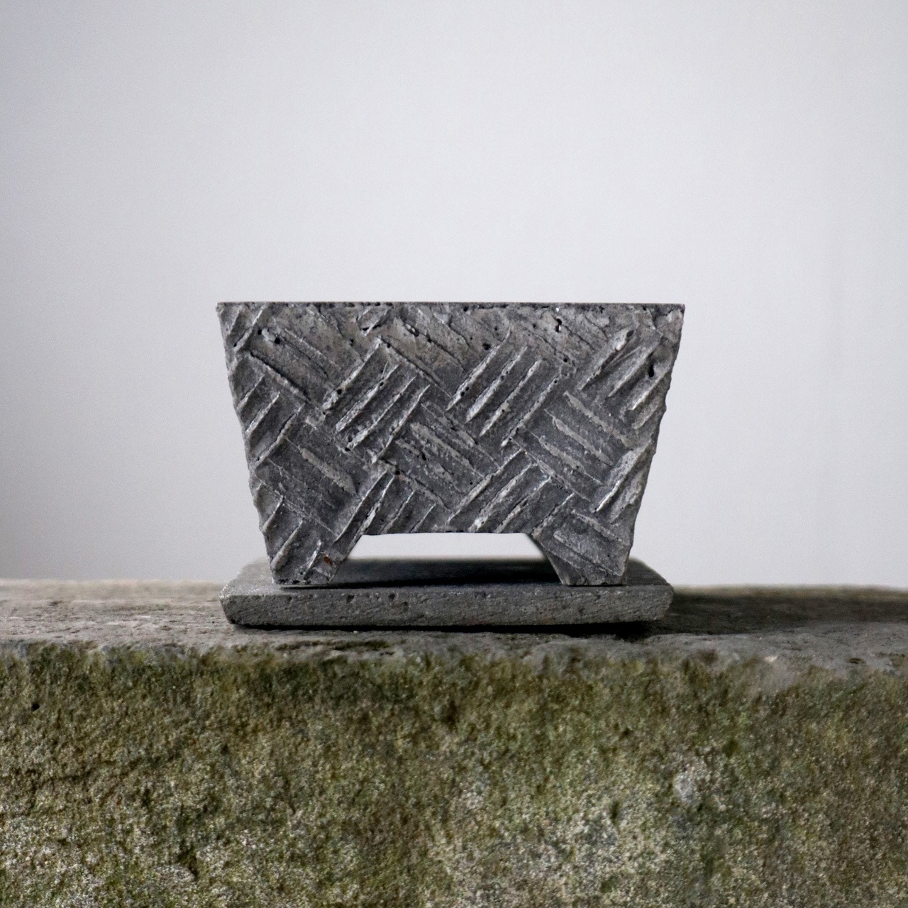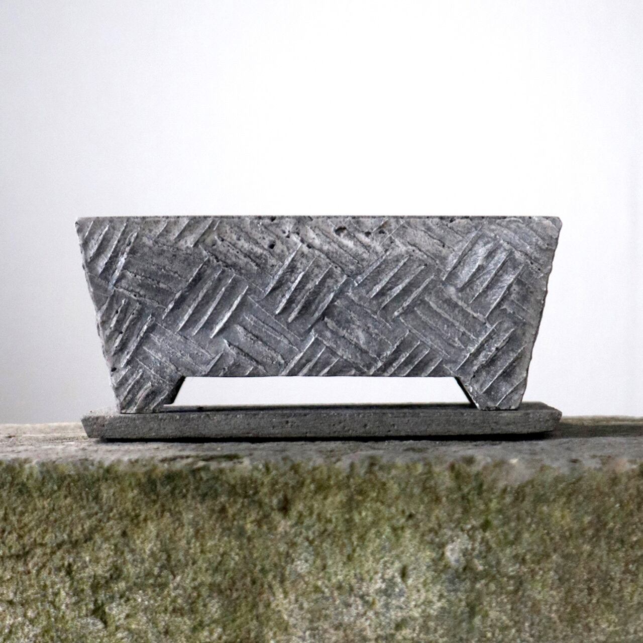 グリーンをこよなく愛するロビー。そんな彼が今注目しているのは「日本の盆栽」。日本古来の伝統美をリスペクトしつつ、現代のライフシーンに融合する新たな素材とテイストで開発されたのが、このNeo Japonism ミニ盆栽鉢シリーズ。その中の一つ「The 網代格子」は「漁網」が由来の日本に古来から受け継がれる伝統紋様。古くから広く民衆に親しまれてきた紋様です。ロビーはその日本古来の古典柄をセメントという現代的素材と融合させ、ミニ盆栽鉢シリーズとして展開。日本のライフシーンを考慮し、机上などの狭いスペースでも気軽にグリーンが楽しめるスリムな設計。個性的なルックスだけでなく、小さいながらも保水性や水捌けもしっかり考慮し植物にも優しい。鉢サイズに見合ったグリーンを植えるだけで、いとも簡単に「侘び寂び」が表現できる。また、ミニ鉢と統一感のあるプレートもセットに。そのクールな世界観はロビーならでは。一つ一つ丁寧にロビー本人が仕上げた逸品。ギフト・プレゼントにも最適。