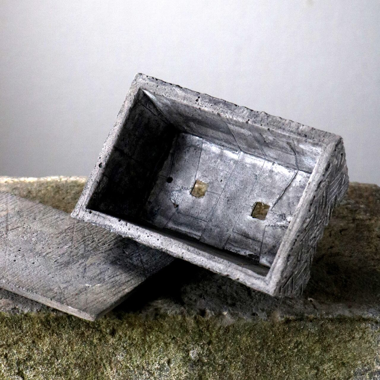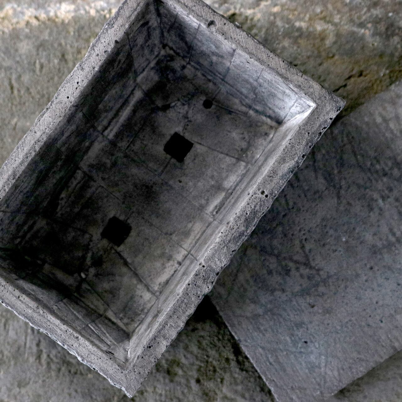 日本古来のインクである「墨」でセメントを染め上げて作る、独特な手法のロビー作品は、欠ける事により素地の色が露出する事があります。しかし、ロビーはこう言います。「それも含めて僕の作品を楽しんで欲しい」と。もし欠けてしまったら、4B程度の鉛筆で欠けた部分を軽く擦り、指で馴染ませて完了。作品にビンテージ感が増し、より愛着も増す事でしょう。つるっとした一般的な陶器とは異なり、環境次第では苔が活着したり、長年の風雨で染みや色ムラができる事もあるでしょう。植物の成長と共に、作品(植木鉢)の成長も是非楽しんでください。