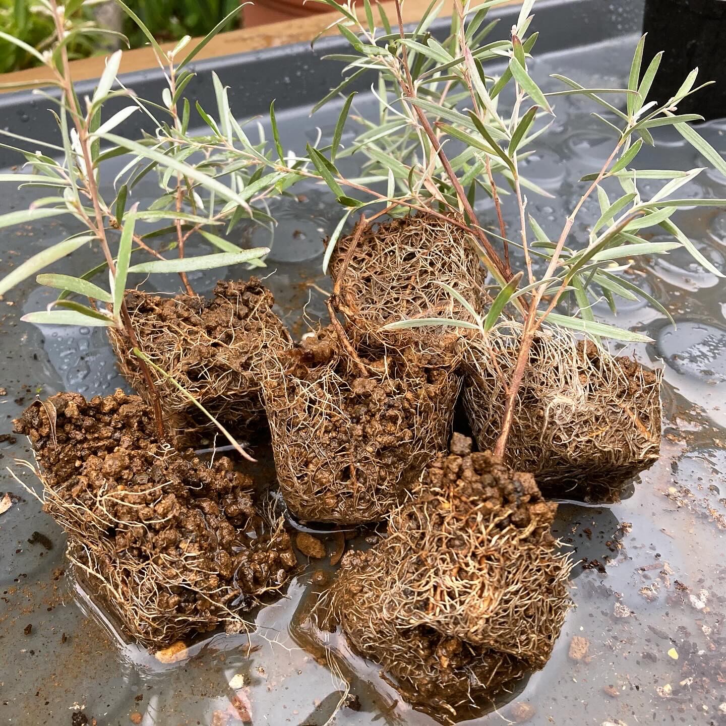 寒挿ししたオリーブ「ネバディロ・ブランコ」の鉢上げ。一本一本はか細いながらも、八方に満遍なく伸びた根がぎっしり。