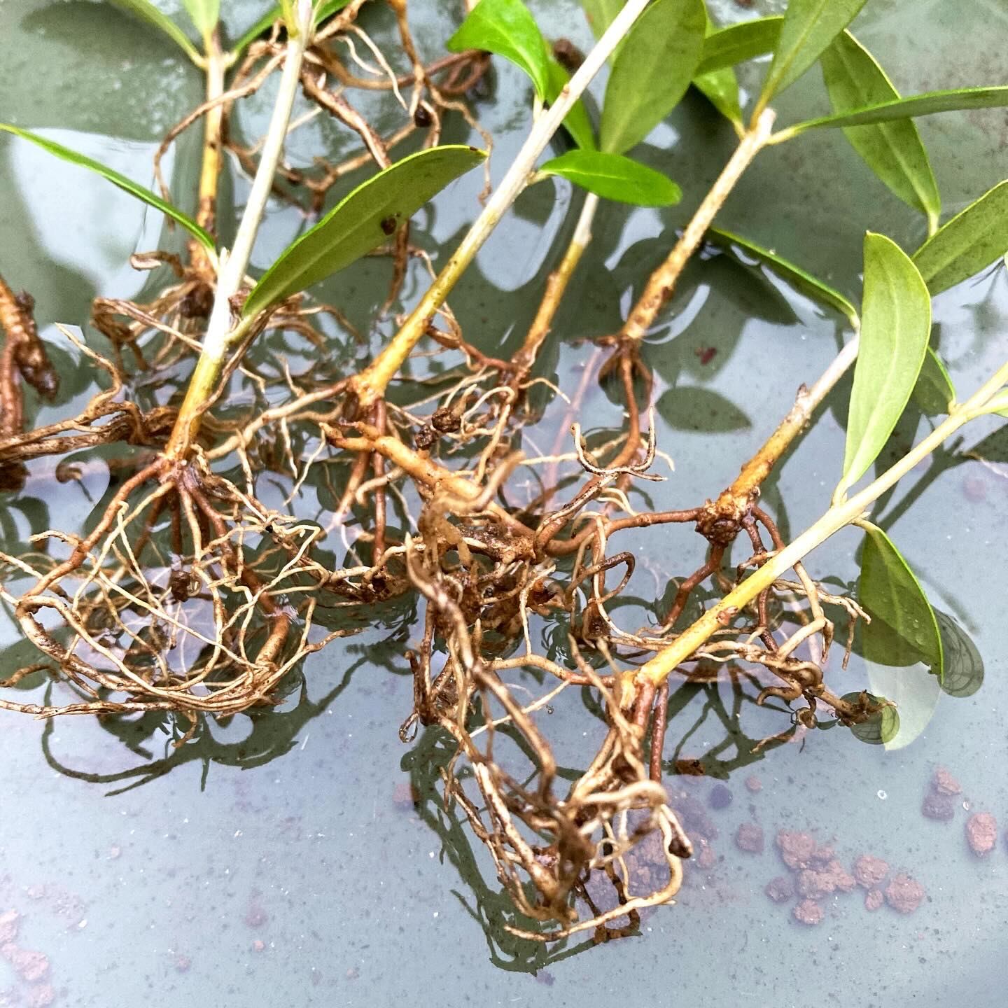 寒挿ししたオリーブ「フラントイオ」の鉢上げ。こんな細い幹から、こんなにもしっかりとした根がぎっしり。